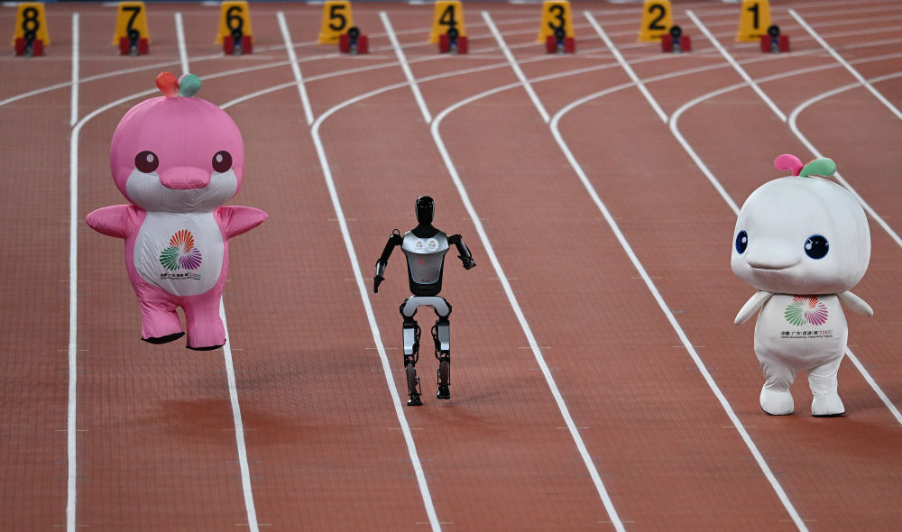11月17日,在田径项目赛事开始前的暖场活动中,机器人和吉祥物喜洋洋、乐融融在广东奥体中心体育场赛跑。新华社记者 周牧 摄