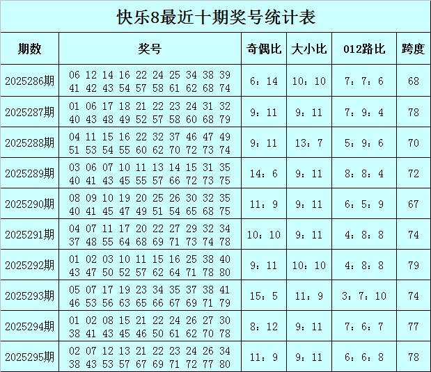 福彩快乐8第2025295期开奖回顾:02 07 12 13 21 22 23 24 26 34 38 43 53 57 67 69 71 72 77 80,其中奖号奇偶比开出11:9,大小比开出9:11,012路比开出6:6:8,和值为811,跨度为78。