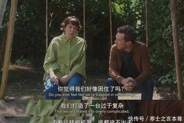 然而,正是在这场将一切外在符号(身份、事业、财产)都燃烧殆尽的对抗后,一种诡异的和谐诞生了。在最终的争吵中,他们吐露心声,在卧室相拥,浑然不知被砸坏的炉灶飘出泄漏的天然气。影片最后的画面旋即变成一片空白,给出了一个开放式结局,这段婚姻关系是彻底终结,还是涅槃重生,每个观众都能找到自己的答案。 英伦戏骨的毒舌与柔肠 一部描摹婚姻系统工程中复杂人性的电影,离不开男女主细腻的表演。有趣的是,电影刚开始我没看出来两位有什么化学反应,那些恩爱场景甚至显得有些诡异,但这种有意为之的疏离和错位感,恰恰成了影片的精妙伏笔。随着剧情推进,当婚姻展现出不和谐的苗头,这对主演的CP感才真正爆发。 主演本尼迪克特·康伯巴奇和奥利维娅·科尔曼都是中国观众比较熟悉的英国演员。本尼凭借《神探夏洛克》《奇异博士》《模仿游戏》《梅尔罗斯》等佳作,收获艺术与商业的双重认可,他最深入人心的银幕形象可以如此概括:A面是夏洛克式的孤高天才,B面是一反有毒男性气概的细腻脆弱。他擅长以复杂长难句的话痨与毒舌叫对方哑口无言,更习惯用紧绷的理智来掩饰汹涌的情感。 另一位主演科尔曼外表亲切,给观众的感觉也很谦逊真诚,甚至有些笨拙。这“非明星”的气场,让她既可以是《宠儿》里乖张、脆弱又充满权力欲的女王,也可以是《伦敦生活》中让人恨得牙根痒痒的难搞后妈。 讲真,本尼“怪癖天才”的银幕人设过于深入人心,以至于很多人忽略了他对细腻情感的驾驭能力。这部电影里他终于得到充分发挥,演出了西奥从明星建筑师到带娃奶爸的失落、不甘与男性自尊的挣扎。他的压抑是内敛的,体现在躲闪的眼神、退缩的肢体语言,和重创过后难以恢复的木然神情里。当他反复观看那支崩溃于暴雨之夜的鬼畜视频,绝望的湛蓝双眸充盈着将滴欲滴的泪水,形成了一种惨烈又好笑的喜剧反差。